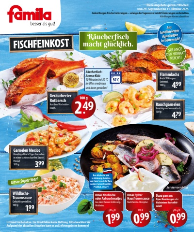 FlammlachsAuch WikingerStremel.100 g4.99Irrt%u00fcmer vorbehalten. F%u00fcr Druckfehler keine Haftung. Bitte beachten Sie: Aufgrund der aktuellen Situation kann es zu Lieferengp%u00e4ssen kommen!Diese Angebote gelten 2 Wochen:vom 29. September bis 11. Oktober 2025.Jeden Morgen frische Lieferungen %u2013 solange der Tagesvorrat reicht! %u00c4nderungen vorbehalten.Abbildungen k%u00f6nnen abweichen.R%u00e4ucherfischAroma-Kick:10 Minuten bei 50 %u00b0Cim Ofen erw%u00e4rmenund dann genie%u00dfen!Garnelen MexicoKnackige Black Tiger Garnelen in einer sch%u00f6n scharfen Sauce.Hossa!100 g3.99Omas Nordischeoder AalrauchmatjesAus dem Herzen SchleswigHolsteins.Omas SylterHausfrauensauceNach famila-Rezeptur.Dazu passen:Opas Hamburger oder Holsteiner Kartofi elsalat!1.99100 g je0.99100 g0.99100 g jeGer%u00e4ucherterRotbarschAus dem Wacholderrauch.2.49RauchgarnelenKnackig und aromatisch.100 g4.79AuslandbasierterAquakulturin D%u00e4nemark!AuslandbasierterAquakulturin D%u00e4nemark!WildlachsTraumsauceGek%u00fchlt genie%u00dfen.100 g1.99Unser Super-Star!