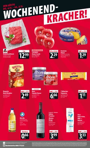 *G%u00fcnstigster Preis der letzten 30 Tage Liebe famila-Kunden, die Abgabe unserer Waren erfolgt nur in haushalts%u00fcblichen Mengen und nur solange der Vorrat reicht. Wir haben die Angebotsmenge jeweils mit dem Ziel geplant, der Nachfrage angemessen entsprechen zu k%u00f6nnen. Es l%u00e4sst sich trotz sorgf%u00e4ltigster Planung nicht immer vermeiden, dass einzelne famila-Warenh%u00e4user bereits fr%u00fchzeitig ausverkauft sind. In diesem Fall wenden Sie sich bitte an die jeweilige Warenhausleitung. Wir danken f%u00fcr Ihr Verst%u00e4ndnis. Personenbezogene Daten f%u00fcr Gewinnspiele werden von famila sowie beteiligter Kooperationspartner nur zur Durchf%u00fchrung und Abwicklung des Gewinnspiels genutzt. Eine Weitergabe der Daten an Dritte erfolgt nicht. Ebenso eine Nutzung f%u00fcr Werbezwecke. Nach Abschluss des Gewinnspiels werden die Daten der Teilnehmer vernichtet. Irrt%u00fcmer vorbehalten. F%u00fcr Druckfehler keine Haftung. Teilweise Bilder mit Lizenz von Shutterstock.com + Shotshop.com benutzt. Alle Preisangaben in Euro. BIO zertifiziert, DE-%u00d6KO-006. Unsere %u00d6ffnungszeiten finden Sie im Internet unter: www.famila-nordost.defamila Handelsmarkt Kiel GmbH & Co. KG, Alte Weide 7%u201313, 24116 KielKundentelefon 0800 7772233NUR G%u00dcLTIG DO., 6.11. %u2013 SA., 8.11.BeemsterPikantholl%u00e4ndischer Schnittk%u00e4semindestens 48% Fett i. Tr.100 g im St%u00fcck1.89* spar 31%1.29RougetteMein Ofenk%u00e4severschiedene Sorten180-g-Packung je(1 kg = 13.83 %u20ac)3.99* spar 37%2.491 kg12.997 H%u00fchnchen Teigwarenverschiedene Sorten600-g-Packung je(1 kg = 1.85 %u20ac)2.09* spar 46%1.11 Mio Mioverschiedene Sortenteilweise koffeinhaltig0,5 Liter (1 Liter = 1.32 %u20ac)zzgl. 0.15 %u20ac PfandFlasche je0.66Frankreich %u2013 Bordeaux  Edition Premi%u00e8re Mission RougeAC, trockenund weitere Sorten0,75-Liter-Flasche(1 Liter = 5.32 %u20ac)6.99* spar 42%3.99DoveBody Lotion, Milk oderBalsamverschiedene Sorten400-ml-Flasche je(1 Liter = 8.33 %u20ac)4.99* spar 33%3.33Rinderhackfleischzum Braten und Garenvielseitig verwendbarTafel%u00e4pfel Honey CrunchSorte %u201eHoneycrisp%u201cKl. I (1 kg = 3.52 %u20ac)650-g-Schale2.29zuckerreduziert MoreChunky Flavourverschiedene Sorten90-g-Dose je(1 kg = 74.00 %u20ac)9.99* spar 33%6.66