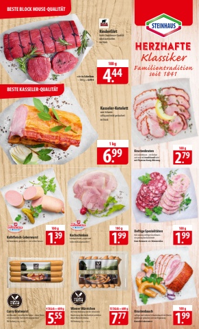 3 Rinderfilet beste Steakhouse-Qualit%u00e4tideal zum Grillenim St%u00fcckoder in Scheiben100 g = 4.99 %u20ac100 g1.39100 g1.99 Deftige Spezialit%u00e4tenfein-w%u00fcrzig, deftiger Geschmack %u2013 ein gelungener AufschnittGuts-Rotwurst oder Kr%u00e4uters%u00fclze100 g1.99Krustenbratenein Leckerbissen %u2013 ein Unikatzart und mild traditionell oder mit Thymian-Honig-W%u00fcrzung100 g2.79Curry Bratwurstder Klassiker %u2013 vom Kind bis Senior %u2013 diese Wurst ist von unserem Tisch nicht wegzudenkenSB-Packung (1 kg = 9.25 %u20ac)4 St%u00fcck = 600 g5.55Wiener W%u00fcrstchendie feine W%u00fcrzung und die schonende R%u00e4ucherung %u00fcber Buchenholz verleihen dieser Wurst ihr AromaSB-Packung (1 kg = 11.43 %u20ac)15 St%u00fcck = 680 g7.77 Krustenbauchsaftiger und leckerer Schweinebauch mit Kruste goldbraun gebacken oder zur Erg%u00e4nzung: Kasseler Leberwurst100 g1.99BESTE KASSELER-QUALIT%u00c4T Kasseler-Kotelettvom Schweinsaftig und mild ger%u00e4uchertim St%u00fcck6.991 kgBESTE BLOCK HOUSE-QUALIT%u00c4T4.44100 g100 g199 Kochschinkenhandgeschn%u00fcrt, gegart und lecker mild anger%u00e4uchertKalbfleisch-Leberwurstim Naturdarm, ger%u00e4uchert %u2013 ein echter Genuss